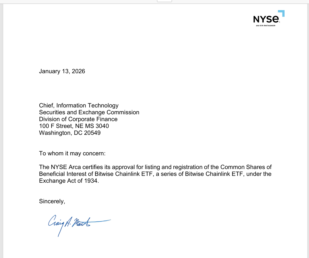 Bitwise obtiene la aprobación regulatoria para el ETF de Chainlink, permitiendo su cotización en NYSE Arca y la exposición regulada a LINK.