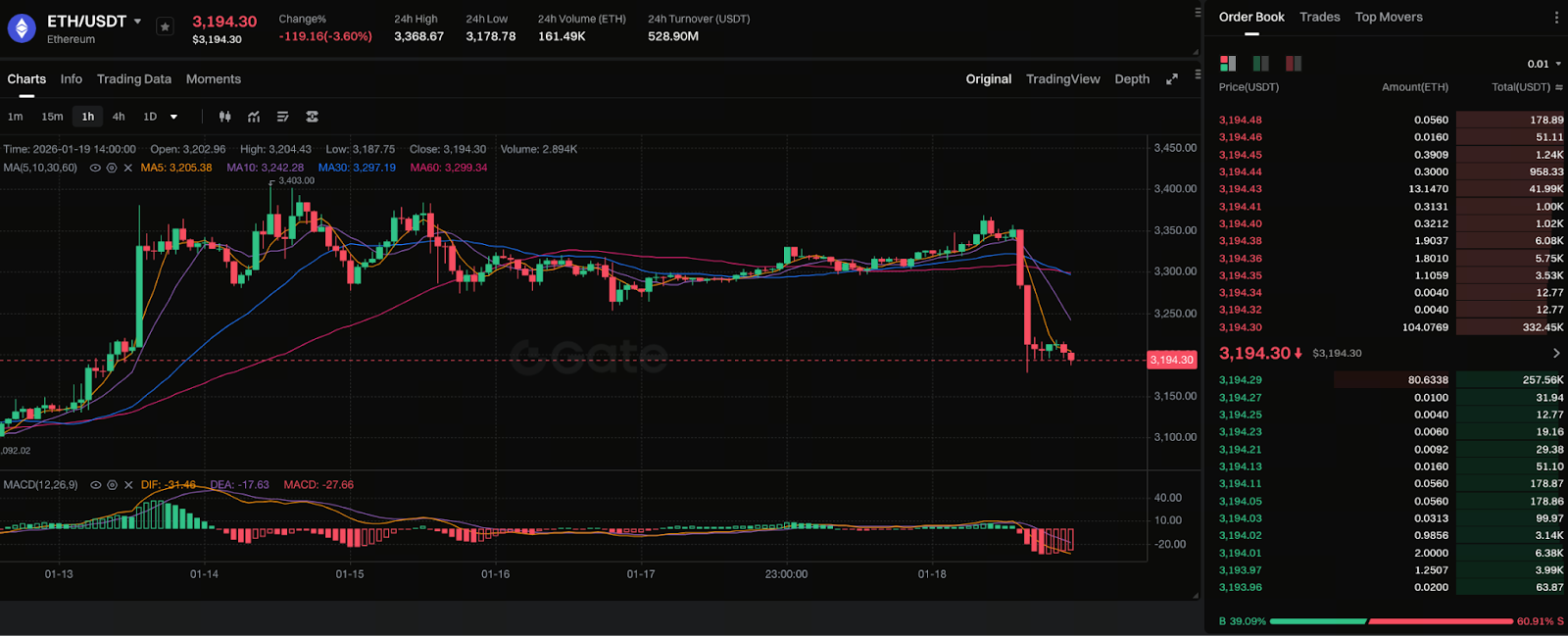 Au 19 janvier 2026, Ethereum (ETH) évolue entre 3 200 et 3 400 $, multipliant les tentatives de franchissement haussier, mais sans réussir à s’installer durablement au-dessus de la résistance. Les acheteurs et les vendeurs restent en confrontation à des niveaux de prix critiques, et le marché affiche une forte division sur la direction à venir. Les acheteurs cherchent un franchissement décisif pour ouvrir un potentiel haussier supplémentaire, tandis que les vendeurs utilisent la zone de résistance pour provoquer des corrections à court terme.