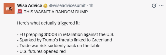 La baisse d’aujourd’hui a été déclenchée par une flambée soudaine du risque géopolitique mondial — en particulier, l’escalade des tensions commerciales entre les États-Unis et l’Europe.