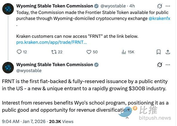 Wyoming meluncurkan stablecoin dolar AS pertama di dunia yang didukung oleh kredit pemerintah negara bagian, $FRNT. Negara bagian yang konservatif ini, yang pernah makmur dari tambang batu bara, apakah dapat menggunakan aset digital untuk menutupi kekurangan keuangan dan menjembatani kesenjangan kekayaan? Artikel ini berasal dari tulisan Bootly, disusun, diterjemahkan, dan ditulis oleh BitpushNews.
