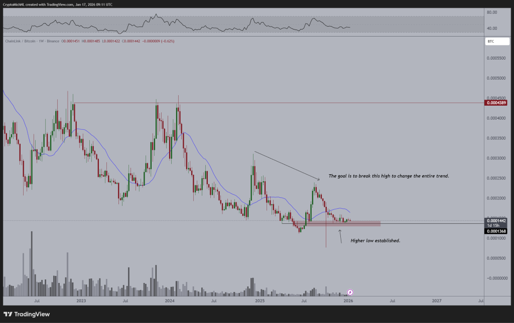 На протяжении большей части этого цикла цена LINK следовала довольно знакомому сценарию на графике LINK/BTC. Она растет, сталкивается с сопротивлением, затем медленно снижается и снова идет вниз.