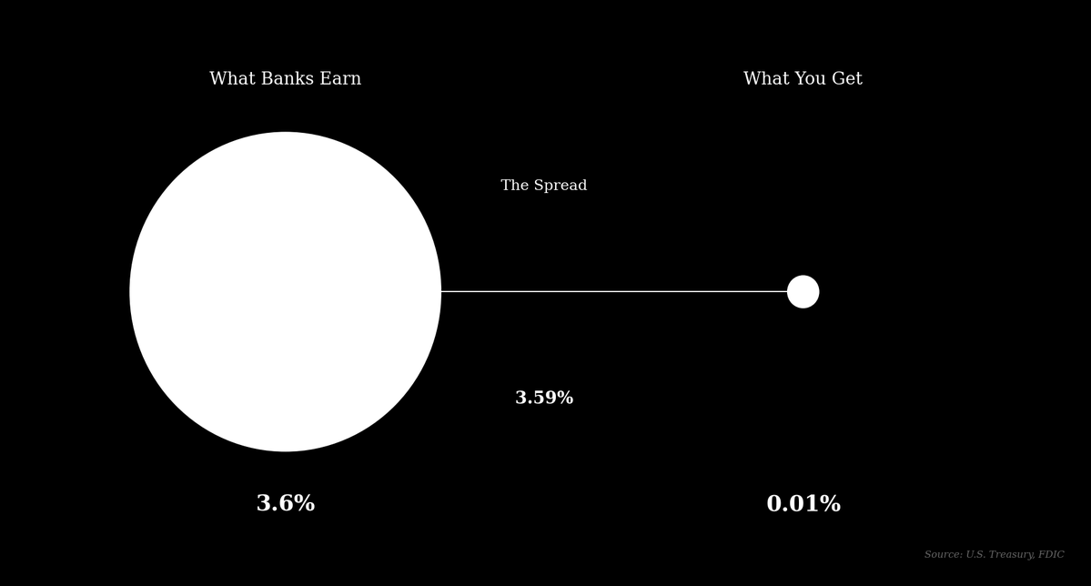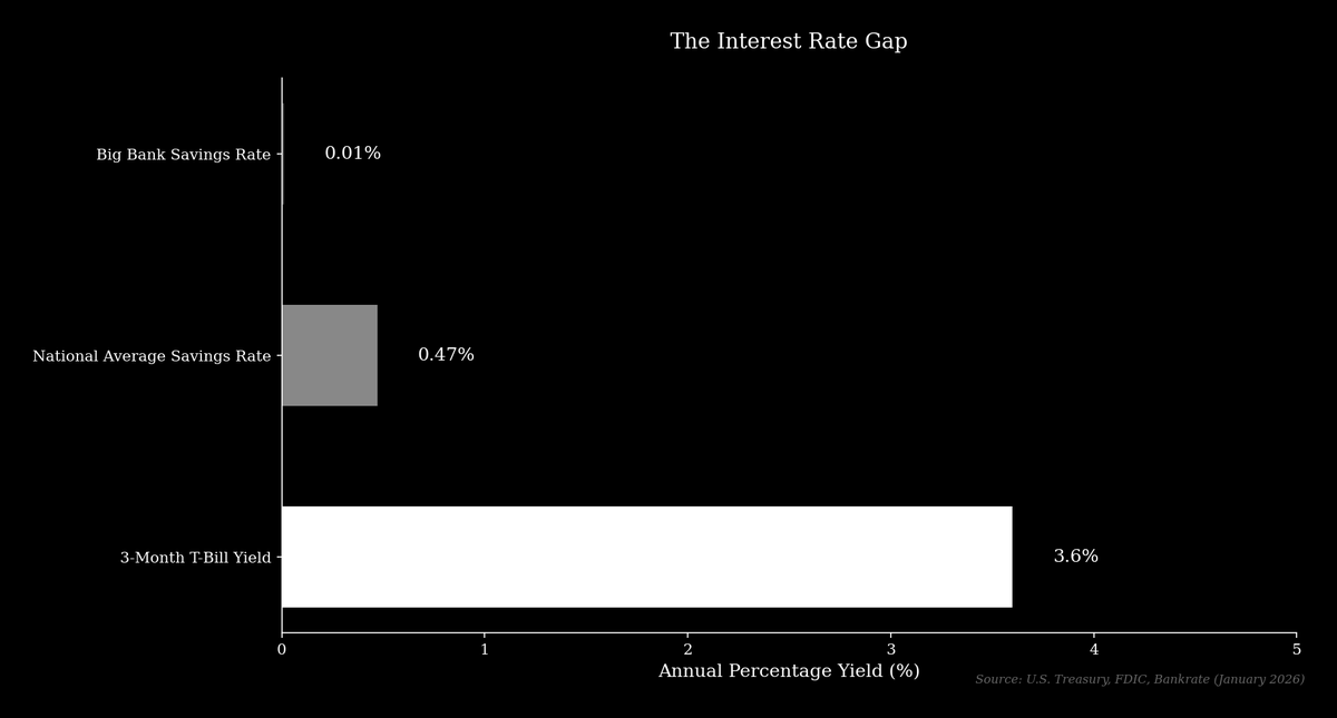 As of early 2026, the national average interest rate on a savings account is 0.47% APY, while the nation’s largest banks, including JPMorgan Chase and Bank of America, offer a standard rate of 0.01% APY on basic savings accounts. During the same period, the yield on a risk-free 3-month U.S. Treasury bill was approximately 3.6%. A large bank can therefore take a customer’s deposit, purchase a government bond, and capture a spread of over 3.5% with minimal risk.