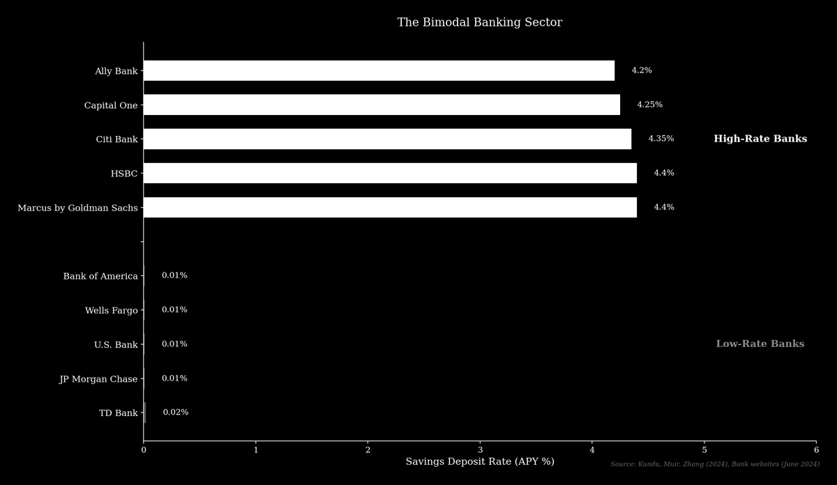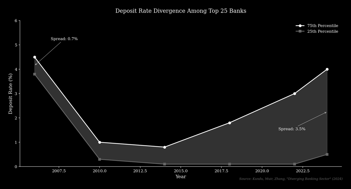 High-rate banks, such as Marcus by Goldman Sachs or Ally Bank, often operate online and compete on price by offering deposit rates closer to market rates. Research from Kundu, Muir, and Zhang shows that the spread between the 75th and 25th percentile of deposit rates among the top 25 banks widened from 0.70% in 2006 to over 3.5% today.