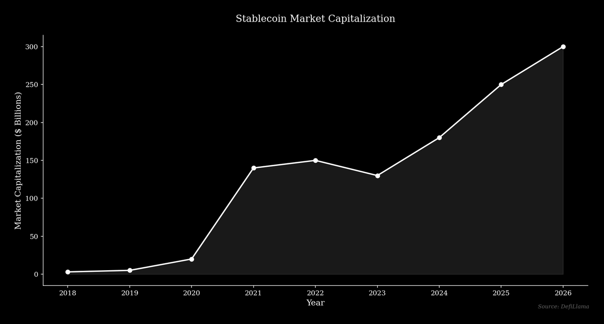 The stablecoin market has expanded at a similar pace, growing from a total market capitalization of just over $4 billion in early 2020 to over $300 billion by 2026. The largest stablecoin, Tether (USDT), crossed a market cap of $186 billion in 2026. This expansion indicates a demand for a digital dollar that can move freely and potentially earn a competitive yield.