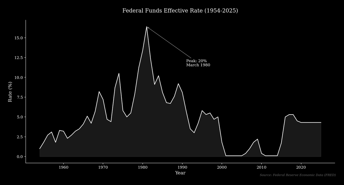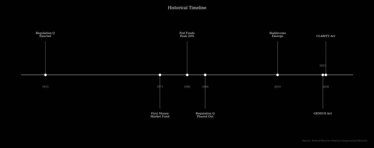 The current conflict over stablecoin yield is similar to the historical conflict over Regulation Q, a rule enacted during the Great Depression that limited the interest rates banks could pay on deposits to prevent “excessive competition.” For decades, the rule had little effect because market rates were below the legal caps, but by the 1970s, rising inflation and interest rates made the caps binding. The federal funds rate, which had been below 5% for most of the 1960s, rose dramatically, peaking at 20% in March 1980, while banks were legally prohibited from offering competitive rates.