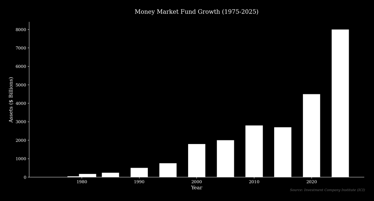 In 1971, Bruce Bent and Henry Brown created the first money market mutual fund, the Reserve Fund, which offered savers market-rate yields with check-writing features. Today, protocols like Aave serve a similar function, allowing users to earn yield on their deposits without a bank intermediary. These funds grew from 76 funds with $45 billion in assets in 1979 to 159 funds with over $180 billion just two years later, and today hold over $8 trillion.