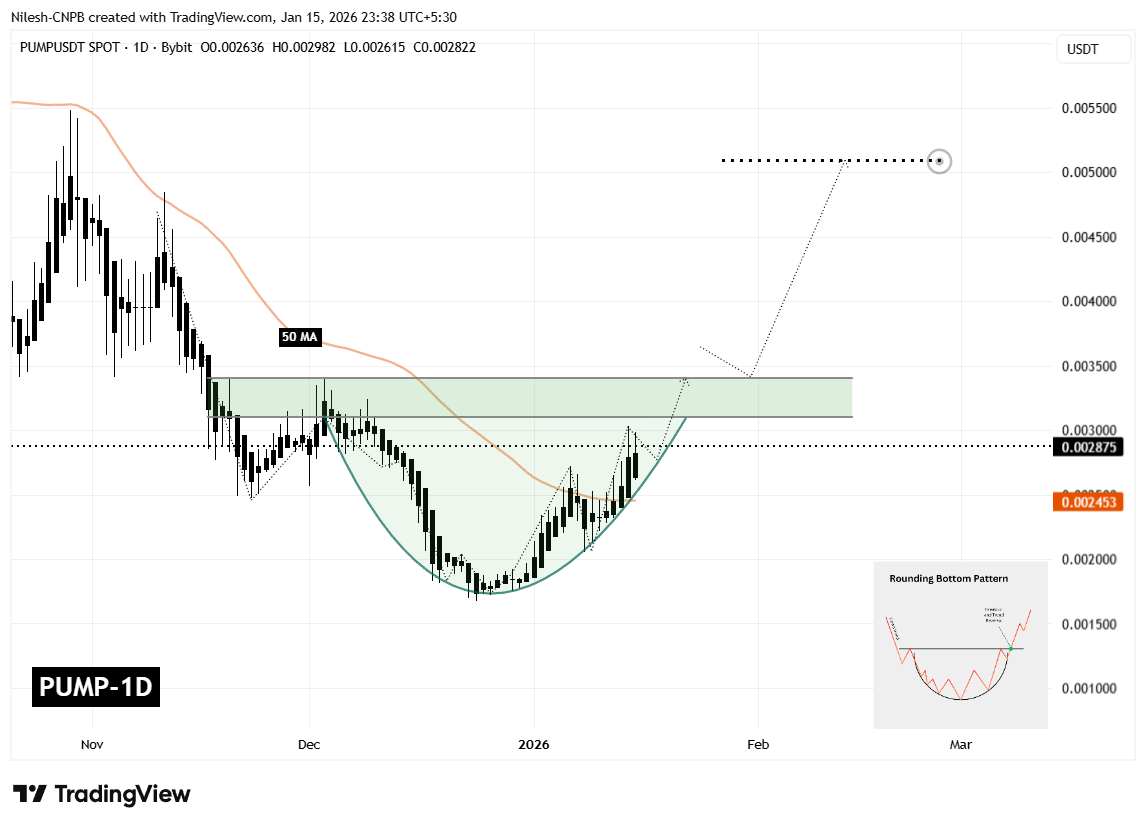 If PUMP can secure a clean daily close above the $0.003107–$0.003396 resistance zone, it would confirm a breakout from the rounding bottom formation. A successful breakout followed by a retest of this zone as support would significantly strengthen the bullish case and suggest that a new upward leg is underway.