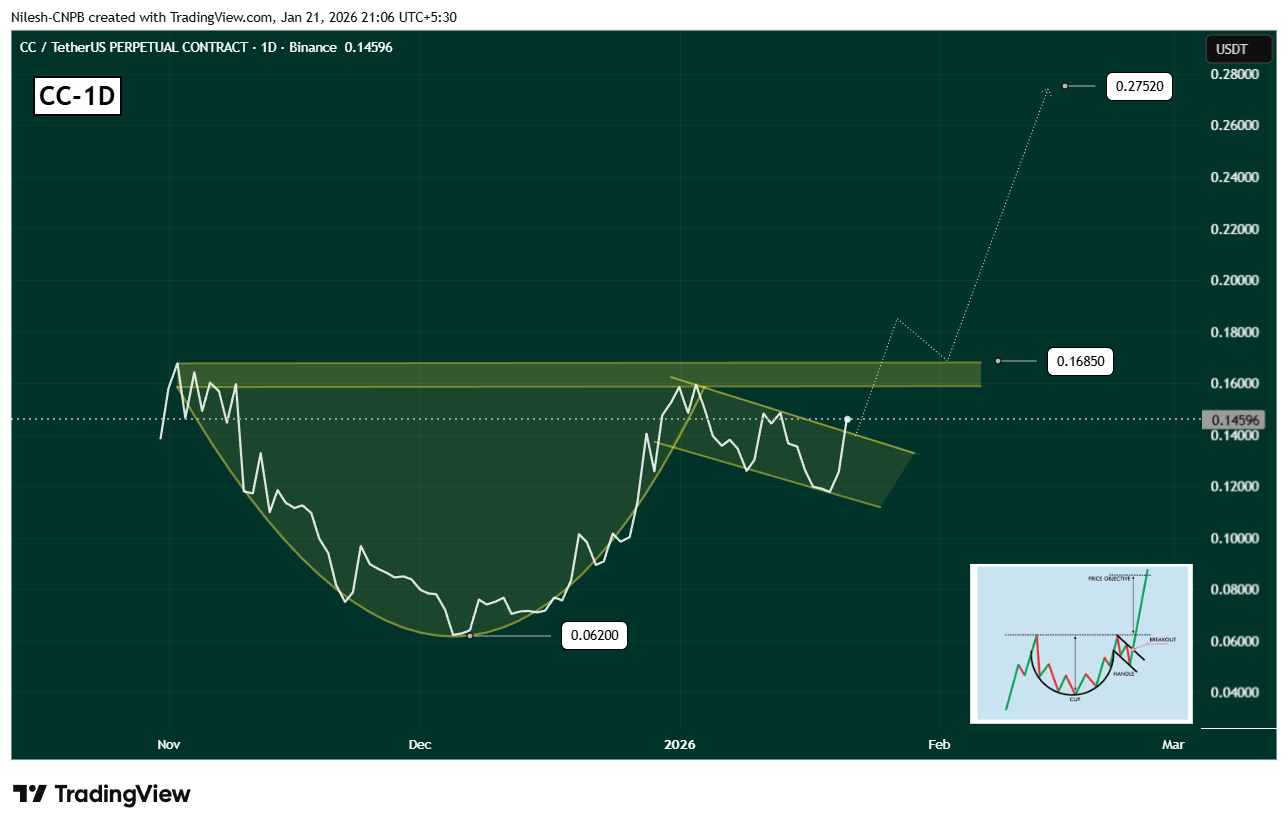 • CC has broken above the handle resistance near $0.1413, signaling early bullish momentum.