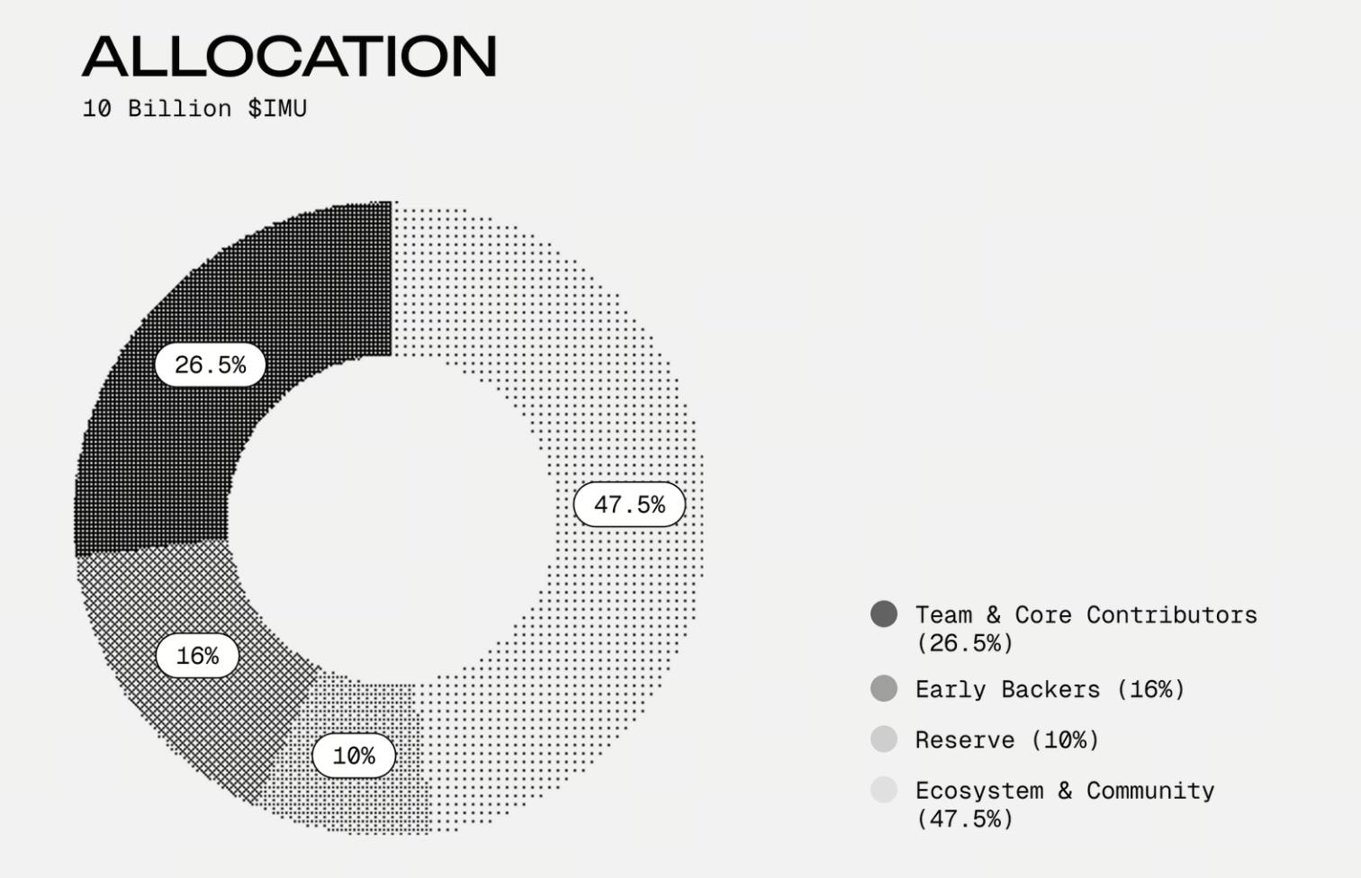 IMU áp dụng mô hình nguồn cung cố định với tổng cung ban đầu 10 tỷ token. Việc phát hành token phụ thuộc vào tốc độ phát triển của hệ sinh thái.