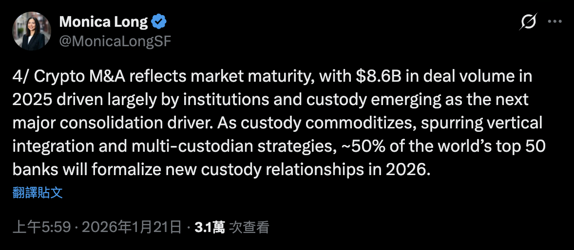 Nguồn hình ảnh: X/@MonicaLongSF Ripple Tổng giám đốc Monica Long dự đoán, khoảng 50% trong top 50 ngân hàng toàn cầu sẽ thiết lập thỏa thuận lưu ký tiền mã hóa chính thức trong năm 2026