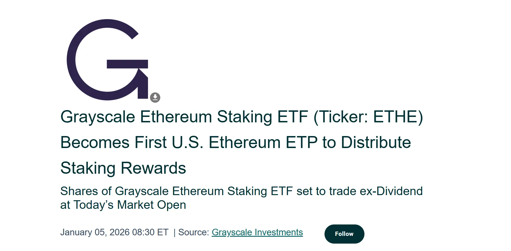 現在,這個鴻溝正在被 ETF 填平。根據灰度此次的分配方案,ETHE 持有人每持有一股將獲得 0.083178 美元,該金額反映了基金在相應期間通過質押獲得並已出售的收益,且派發將於 2026 年 1 月 6 日(派息日)進行,分配對象為截至 2026 年 1 月 5 日(記錄日)持有 ETHE 份額的投資者。