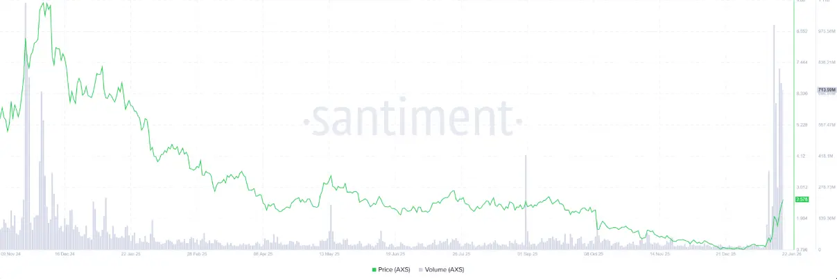 同時,Santiment的數據顯示,AXS全鏈交易量——包括所有鏈上應用的總交易價值——在1月17日達到10億美元,為自2024年11月以來的最高點,之後在週四維持在7.1359億美元左右。交易量的增加反映市場關注度日益提升與充裕的流動性,進一步鞏固Axie Infinity的看漲情境。