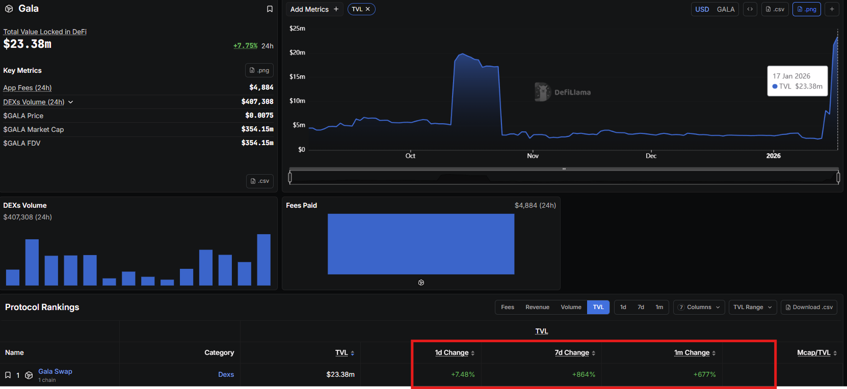 隨著遊戲代幣重新獲得關注,Gala 生態系的活動也在積極擴展。來自 Defillama 的最新數據顯示,GALA 的總鎖倉價值(TVL)在過去 24 小時內上升約 7.48%,而 7 天TVL 更是驚人地激增 864%。在 30 天的範圍內,TVL 增長接近 677%,彰顯資金大量湧入網絡。